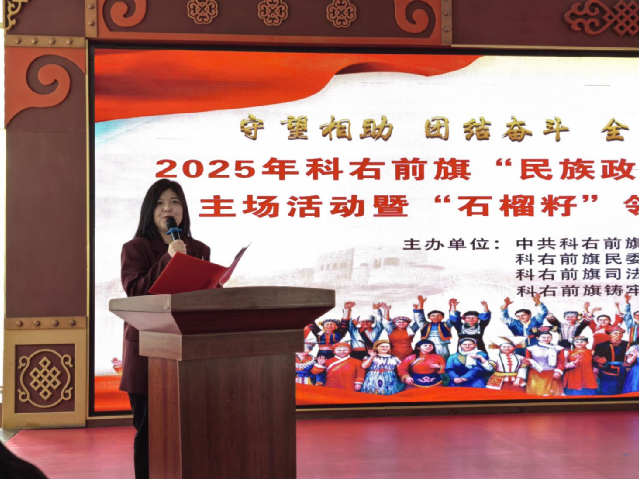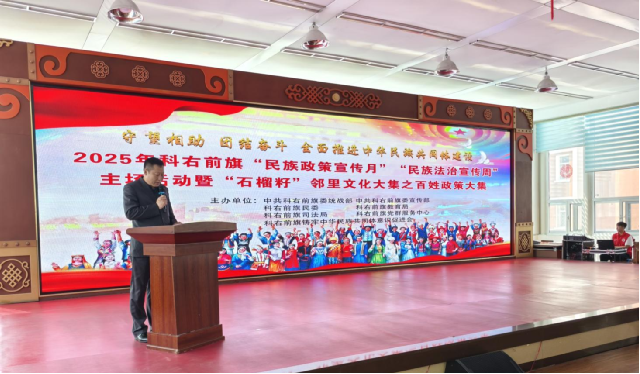 为深入贯彻落实习近平总书记关于加强和改进民族工作的重要思想、在全国民族团结进步表彰大会上的讲话精神和对内蒙古的重要指示精神,以铸牢中华民族共同体意识为工作主线,全面加强党的民族理论政策和法律法规宣传教育,4月28日,旗委统战部、宣传部,旗民委、教育局、司法局、党群服务中心,旗铸牢中华民族共同体意识促进会等多部门联合举办了以“守望相助、团结奋斗,全面推进中华民族共同体建设”为主题的2025年科右前旗“民族政策宣传月”“民族法治宣传周”主场活动。