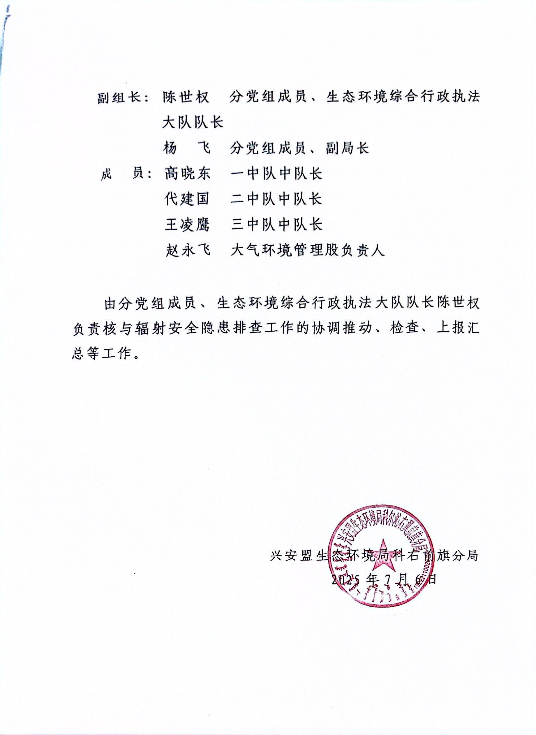 兴安盟生态环境局科右前旗分局关于开展2025年全旗核与辐射安全隐患排查工作的通知