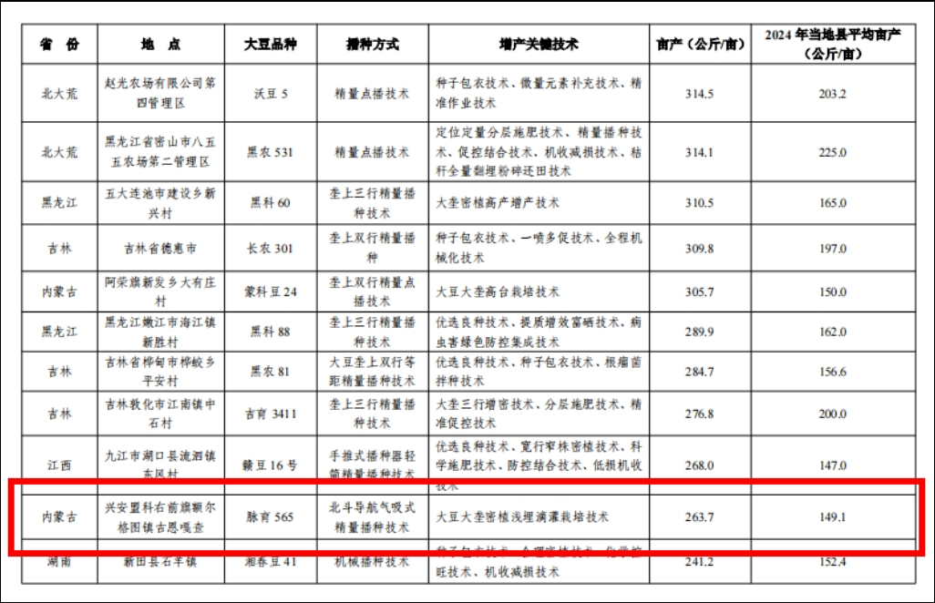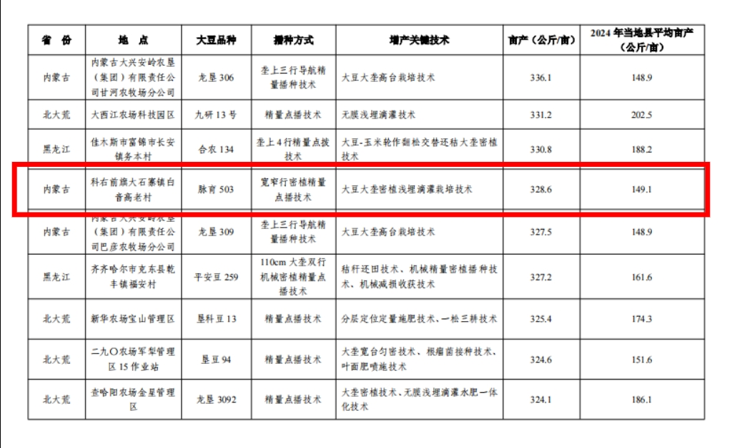 2025年,大石寨镇白音高老村大豆百亩高产田平均亩产达328.59公斤,额尔格图镇古恩嘎查大豆万亩高产田平均亩产达263.73公斤,较去年分别提升9.33%和14.85%,不仅刷新了本地大豆单产纪录,更打破了2024自治区百亩大豆田高产纪录。