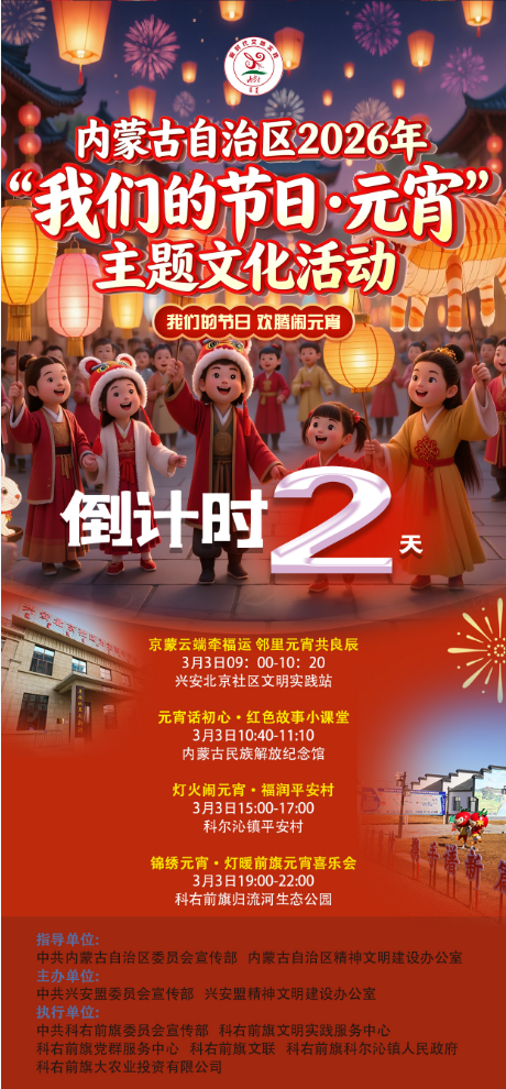 由中共内蒙古自治区委员会宣传部、内蒙古自治区精神文明建设办公室指导,中共兴安盟委员会宣传部、兴安盟精神文明建设办公室主办,中共科右前旗委员会宣传部、科右前旗文明实践服务中心、科右前旗党群服务中心、科右前旗文联、科右前旗科尔沁镇人民政府、科右前旗大农业投资有限公司共同执行的内蒙古自治区2026年“我们的节日·欢腾闹元宵”主题文化活动(主场)启幕仅剩2天,乡野元宵的欢乐序幕即将拉开,科右前旗科尔沁镇平安村番茄大院作为核心打卡地,红绸红毯已备,红灯高挂待启。