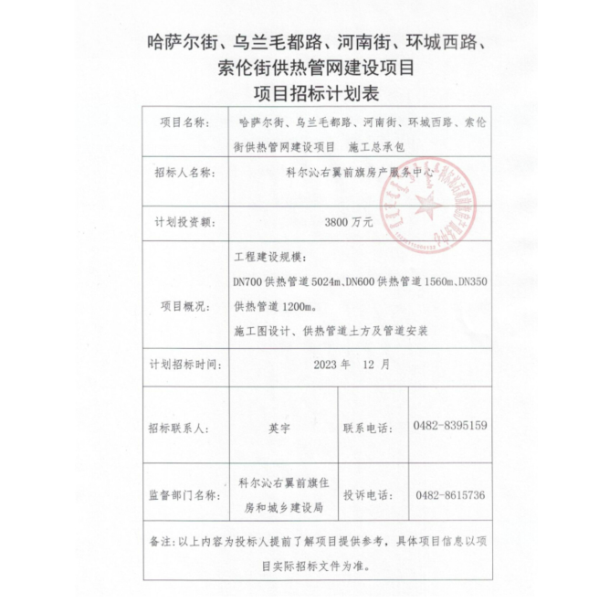哈萨尔街、乌兰毛都路、河南街、环城西路、索伦街供热管网建设项目施工总承包招标计划