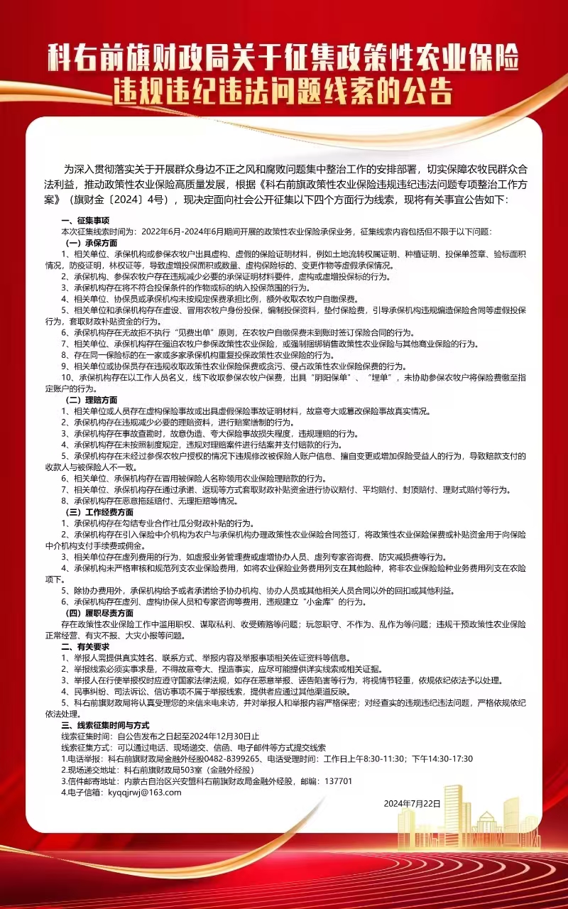 转发公告:科右前旗财政局关于征集政策性农业保险违规违纪违法问题线索的公告