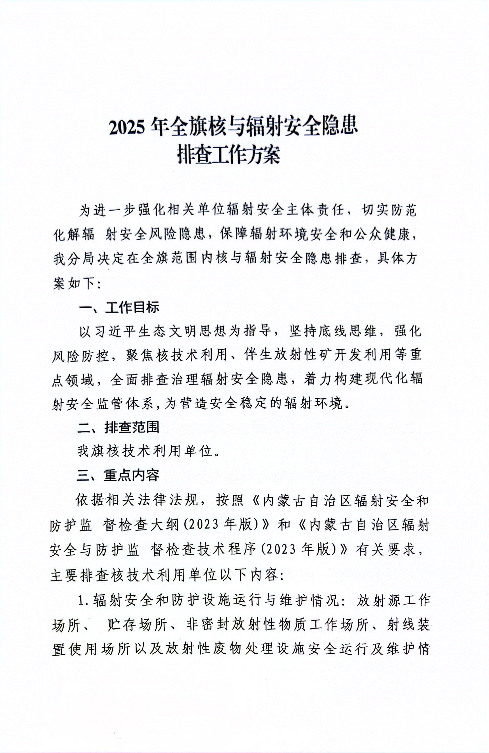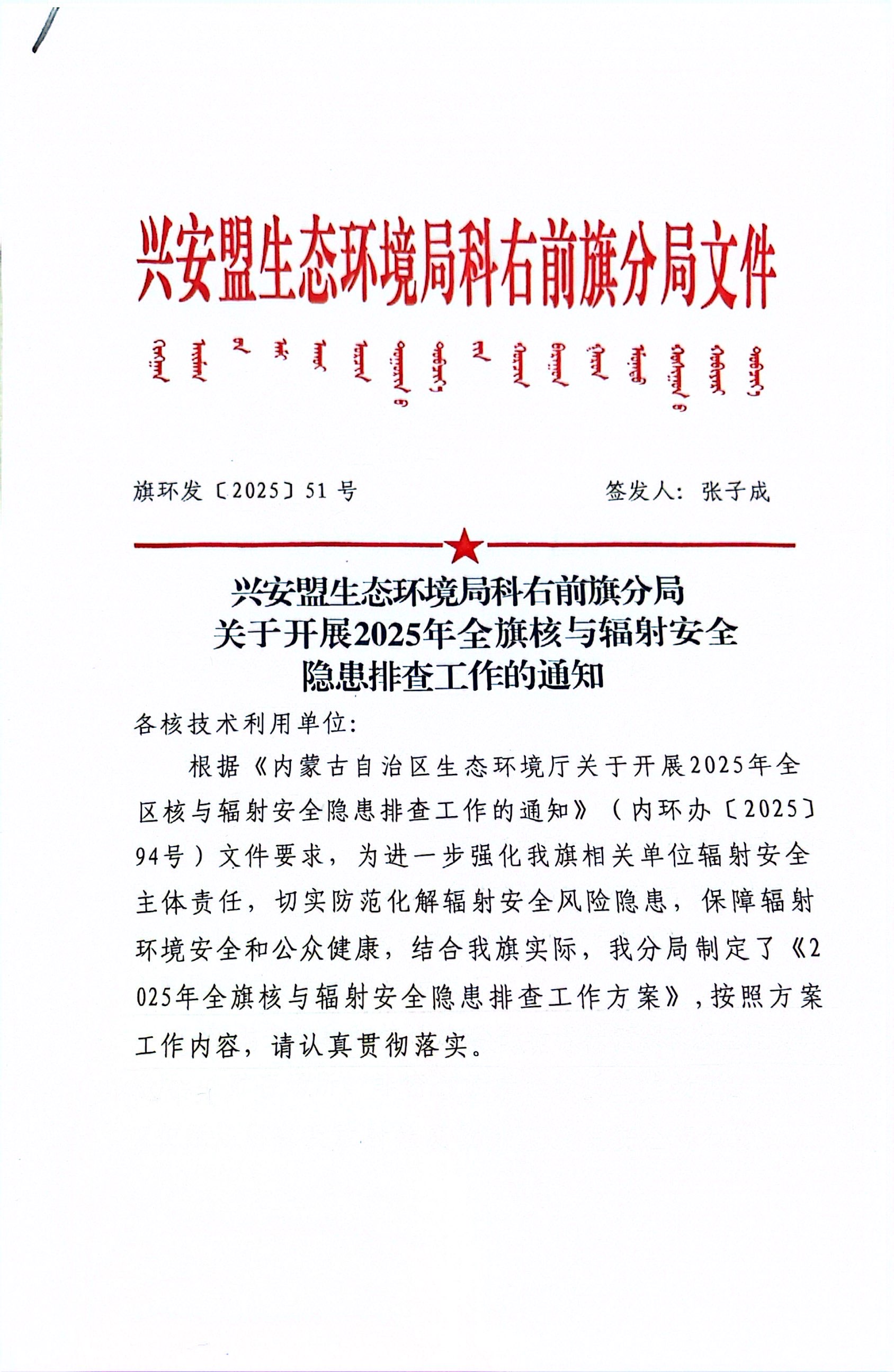 兴安盟生态环境局科右前旗分局关于开展2025年全旗核与辐射安全隐患排查工作的通知