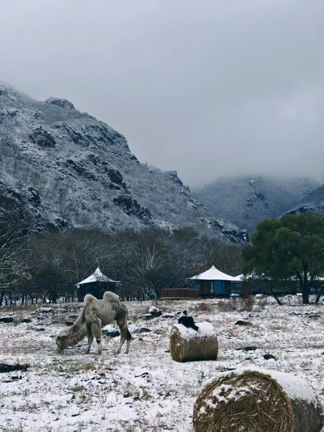 驼食草,犬卧草垛,屋舍覆银偎雪山。