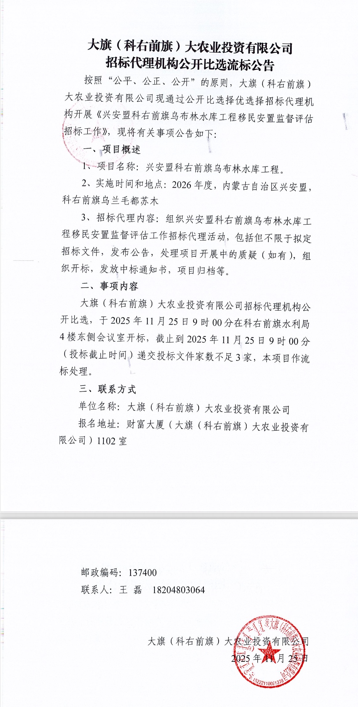 大旗(科右前旗)大农业投资有限公司招标代理机构公开比选流标公告