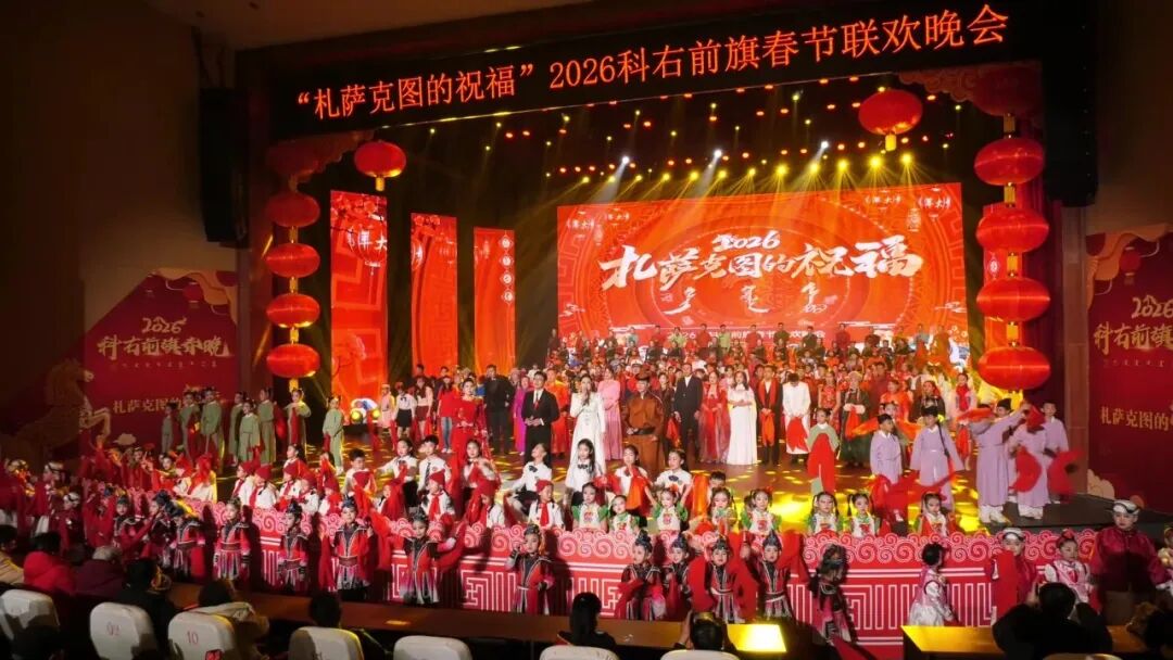 2026科右前旗春节联欢晚会形式多样,内容丰富,用歌舞、短剧、器乐表演等勾勒出科右前旗的文化底蕴与时代活力,生动展现了全旗各族干部群众同心同德奋力绘就中国式现代化科右前旗新篇章的轩昂风貌。同时,晚会以婉转旋律、动人故事为载体,将科右前旗的人文底蕴、北疆特色,全旗经济社会高质量发展的生动实践与百姓安居乐业的幸福图景娓娓道来,让观众在欢声笑语间感受新春佳节的祥和喜乐,沉浸式领略传统文化魅力与家乡发展的蓬勃生机,更凝聚起全旗人民同心筑梦、携手向新的奋进力量,为科右前旗新一年的发展奏响昂扬序曲。