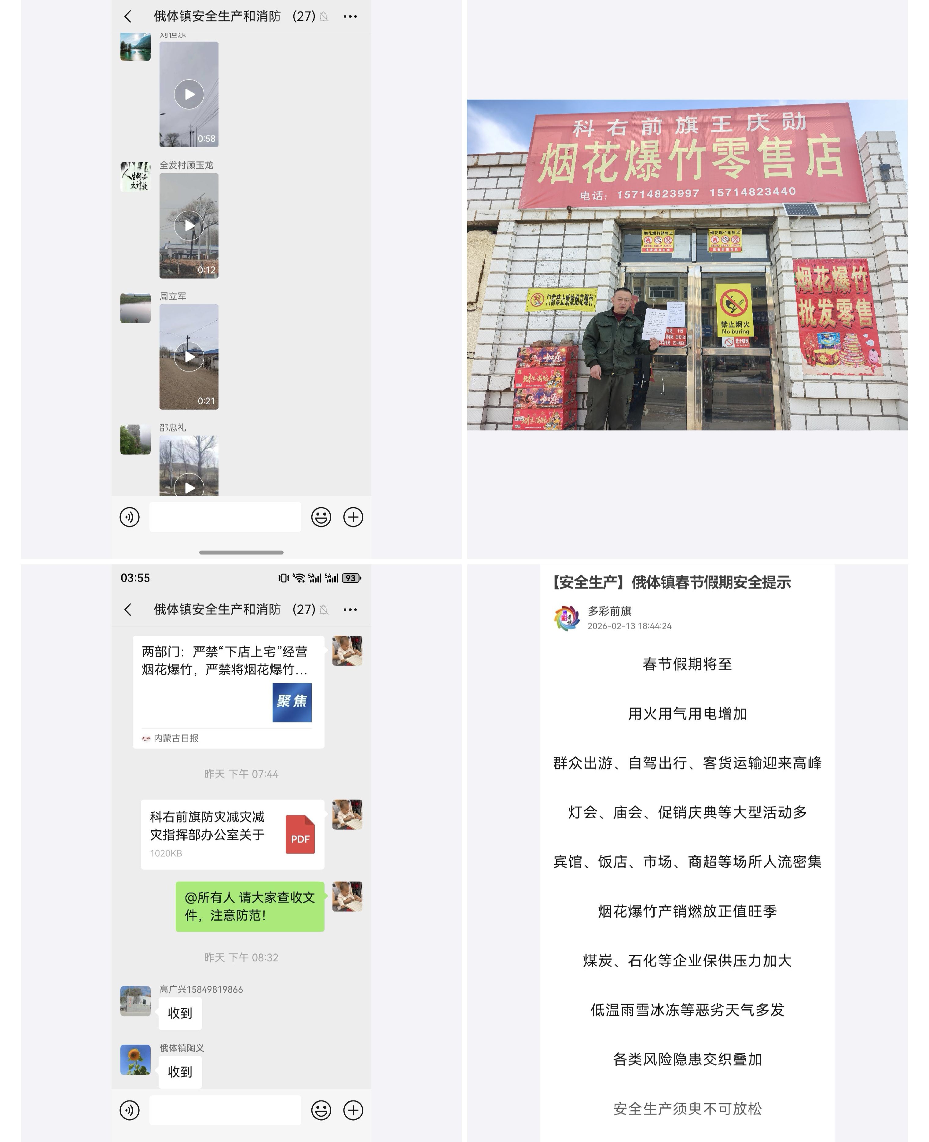 为深入推进全镇烟花爆竹领域全链条安全防控工作,保障人民群众生命财产保全,确保节日期间社会安全稳定,俄体镇采取“听说读写、查堵截控”八项措施,坚决防范和遏制因燃放烟花爆竹导致的各类安全事故。“听”,即运用云广播早中晚循环播放安全生产、“五个严禁三个务必”等内容,在全镇形成浓厚宣传氛围;“说”,即组织社区工作人员对辖区内4家烟花爆竹零售店入户宣讲,张贴“五个严禁三个务必”告示,压实商户主体责任;“读”,即通过微信等载体,在各村各社群里转发江苏连云港、湖北襄阳等地典型事故案例和盟旗两级通告等内容,提升群众安全防范意识;“写”,即组织宣传部门发布“俄体镇春节假期安全提示”,筑牢安全生产宣传阵地。
