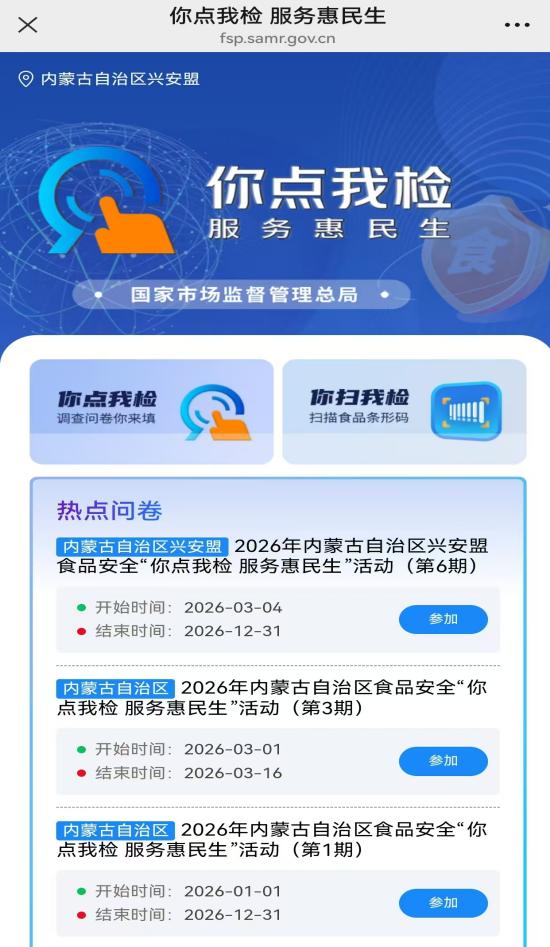 为迎接2026年“3·15”国际消费者权益日,提升消费品质,回应消费者关切,科右前旗市场监督管理局启动食品安全“你点我检惠民生”活动,通过公众投票决定抽检的食品品种,促进食品安全社会共治。您可通过扫描二维码,点选您关注的食品,市场监督管理部门将根据网络投票的结果,组织开展现场抽样检验。