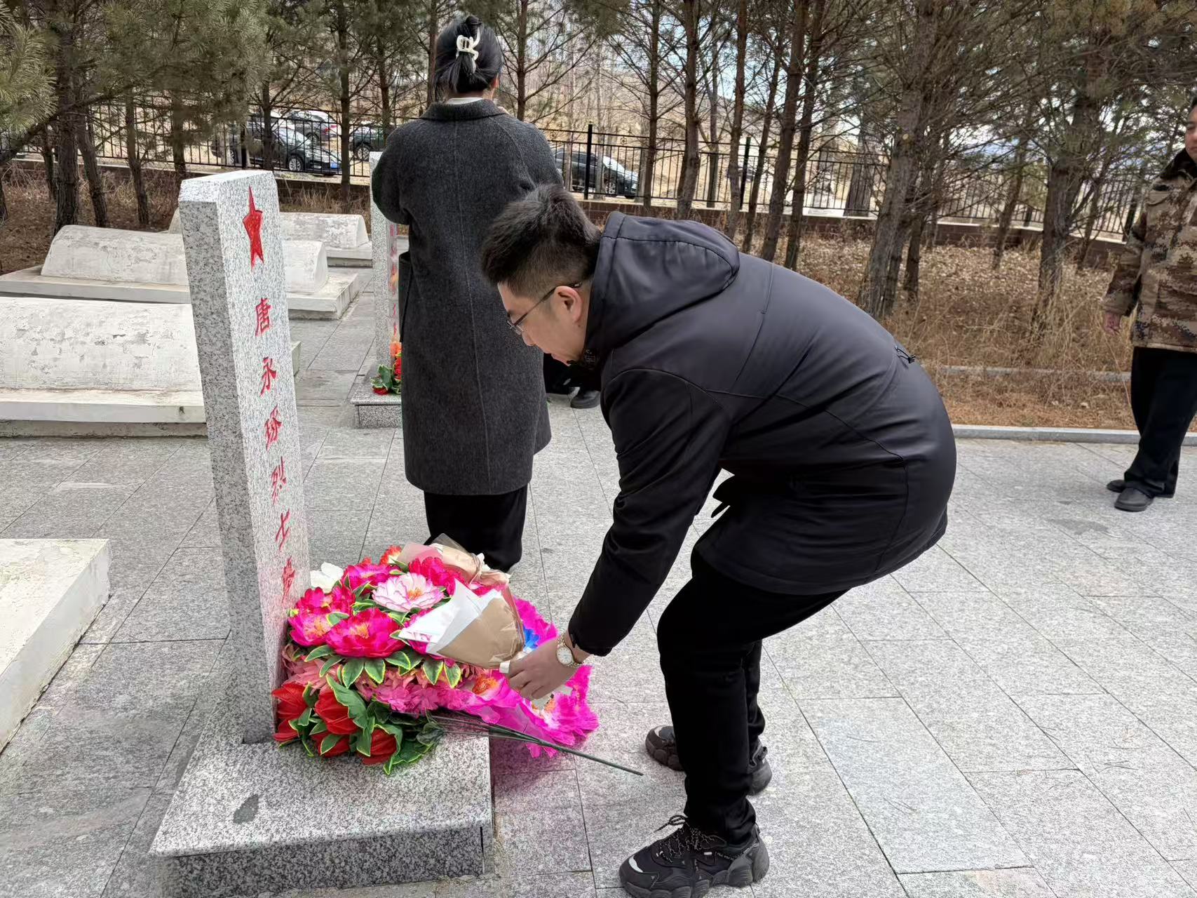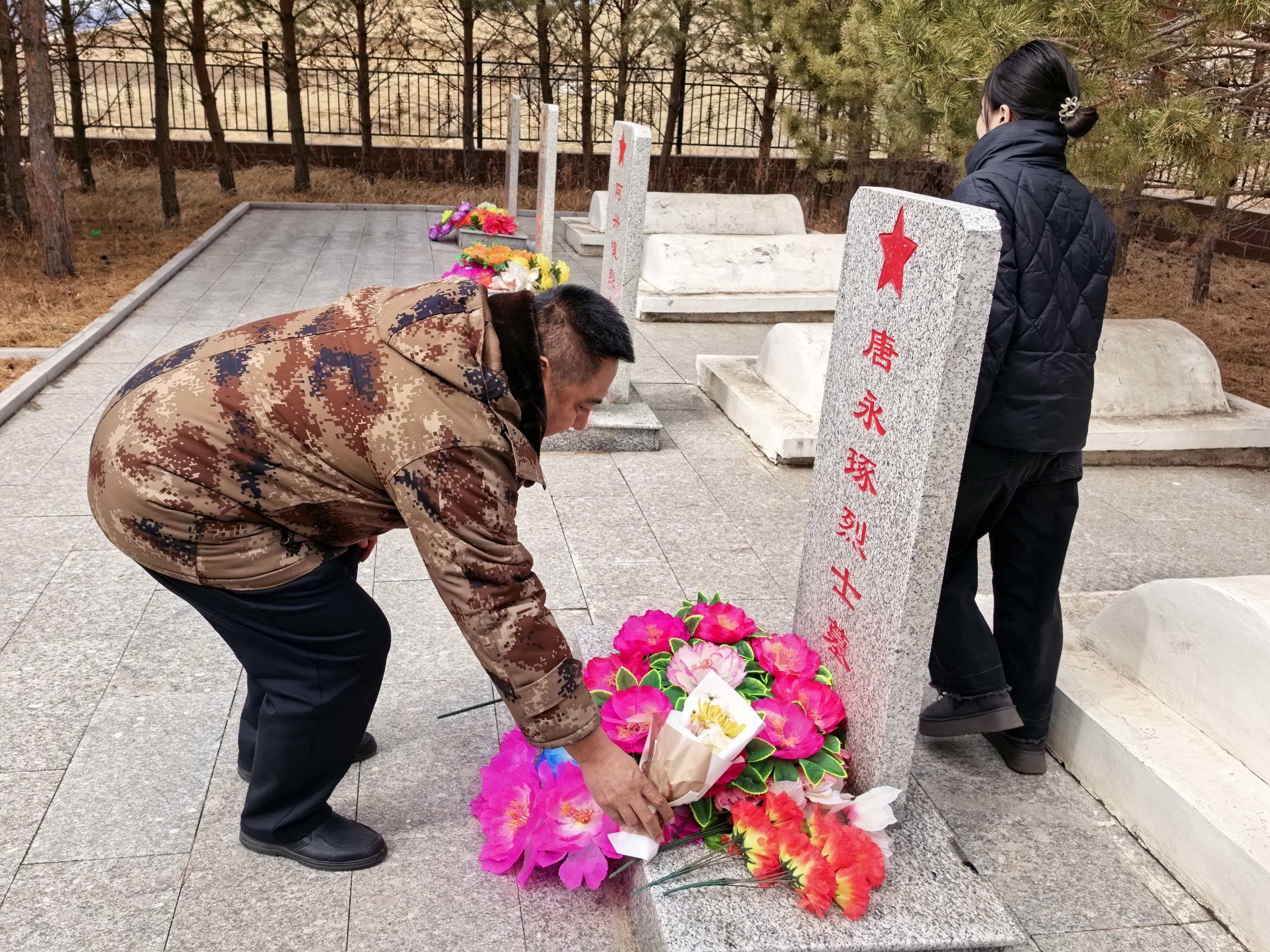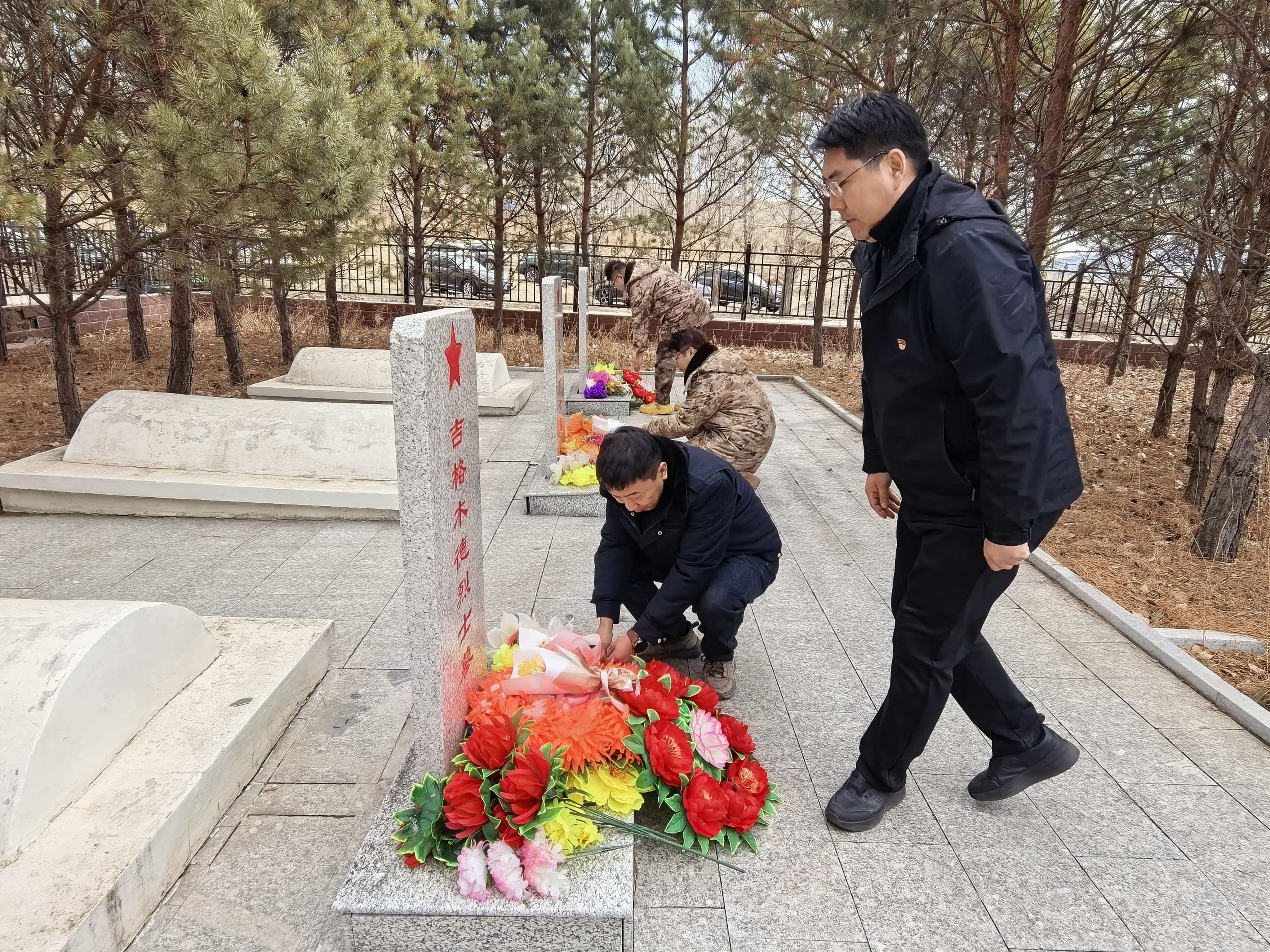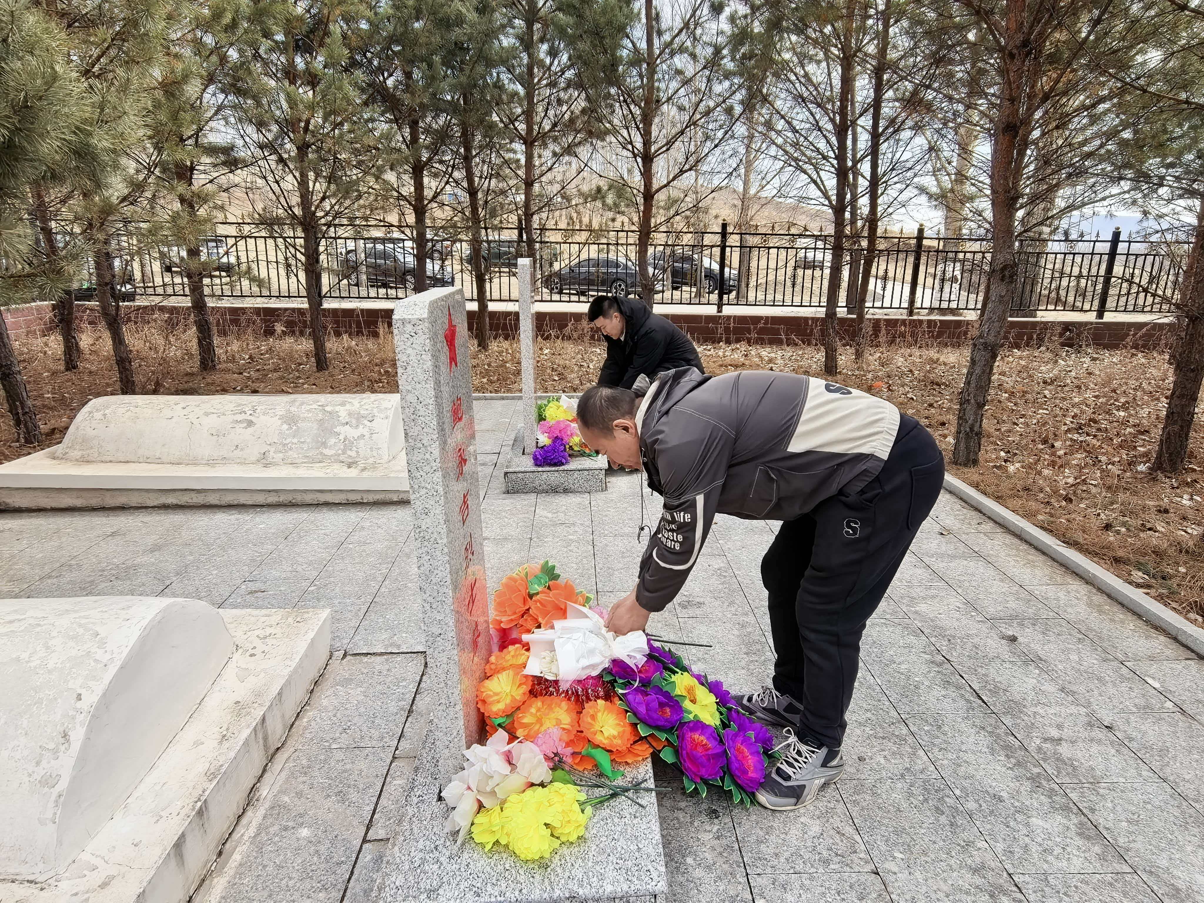 敬献鲜花环节,全体人员依次向革命先烈敬献鲜花,肃立默哀,并行三鞠躬礼,表达对革命先烈的深切哀思与崇高敬意。